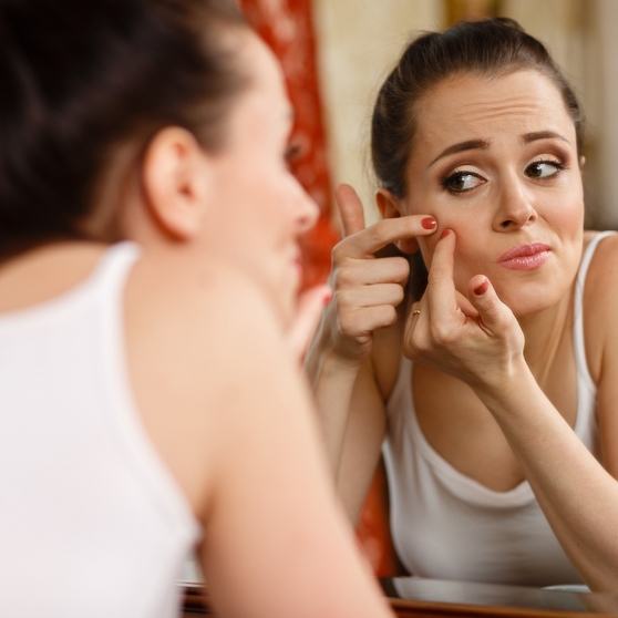Many people are simply prone to it, but acne may also indicate other problems. Blemishes are a symptom of polycystic ovarian syndrome, a common ovarian problem in which a hormone imbalance may lead to cysts in the ovaries or other reproductive problems. But women may also see acne appear around their period, during pregnancy and during menopause.